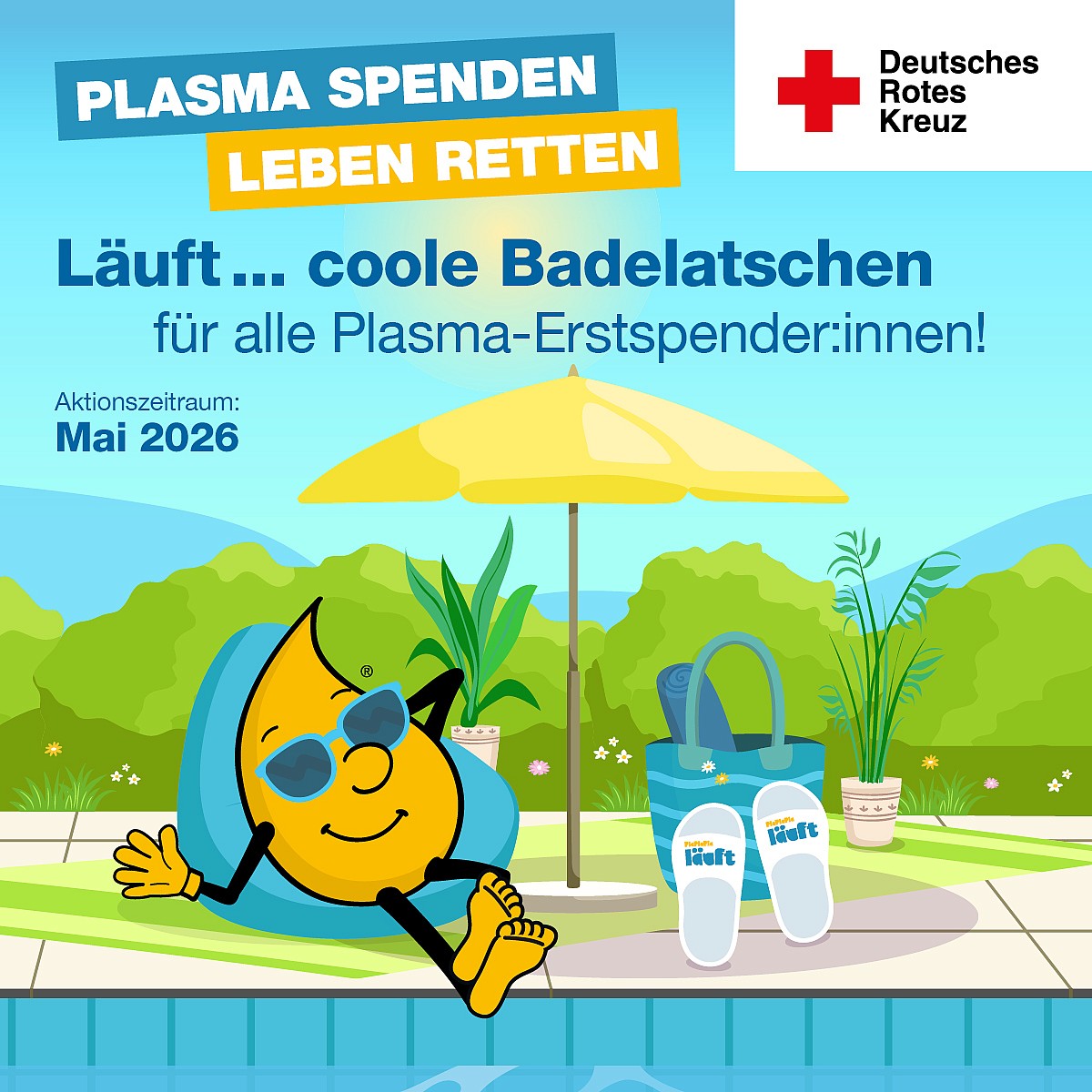 Im Aktionszeitraum Mai 2026 bedanken wir uns bei allen neuen SpenderInnen, welche sich zum ersten mal zur Plasmaspende trauen, mit einem Paar feschen Badeschlappen.