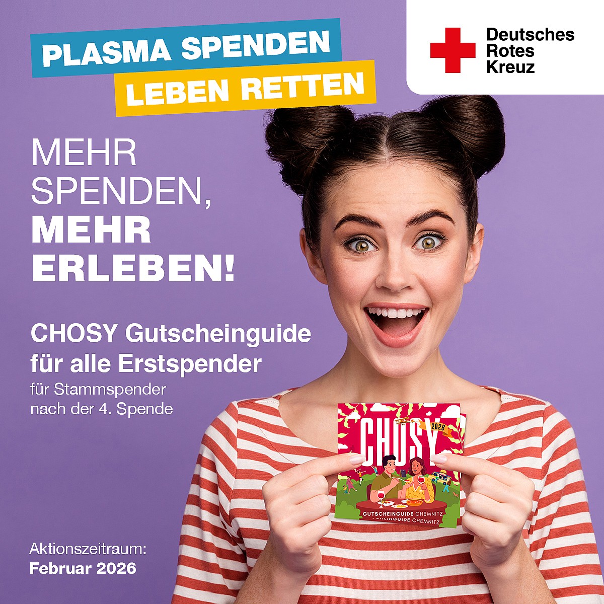 Im Aktionszeitraum Februar 2026 dürfen sich alle neuen LebensretterInnen nach der 1. Spende und treue Spender und Spenderinnen nach der 4. Spende auf das begehrte Gutscheinheft von Chosy für Chemnitz freuen.