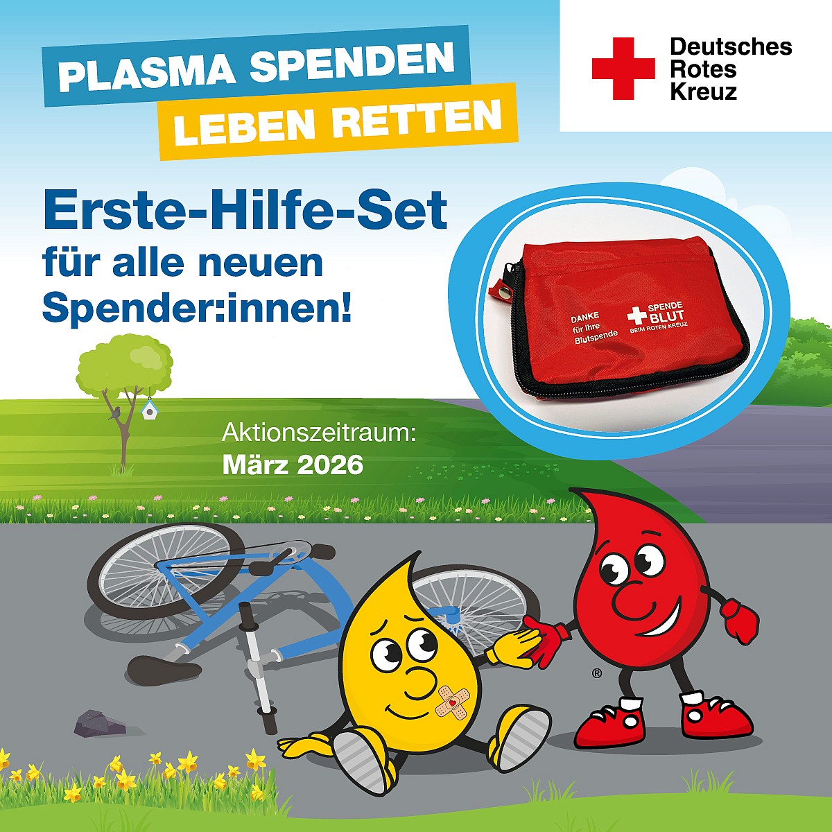 Damit Ihr immer sicher unterwegs seit, bedanken wir uns bei allen neuen Plasmaspenderinnen und Spendern im Aktionszeitraum März 2026 in allen Spendezentren im Bereich Nord-Ost mit einem praktischen Erste-Hilfe-Set für unterwegs.